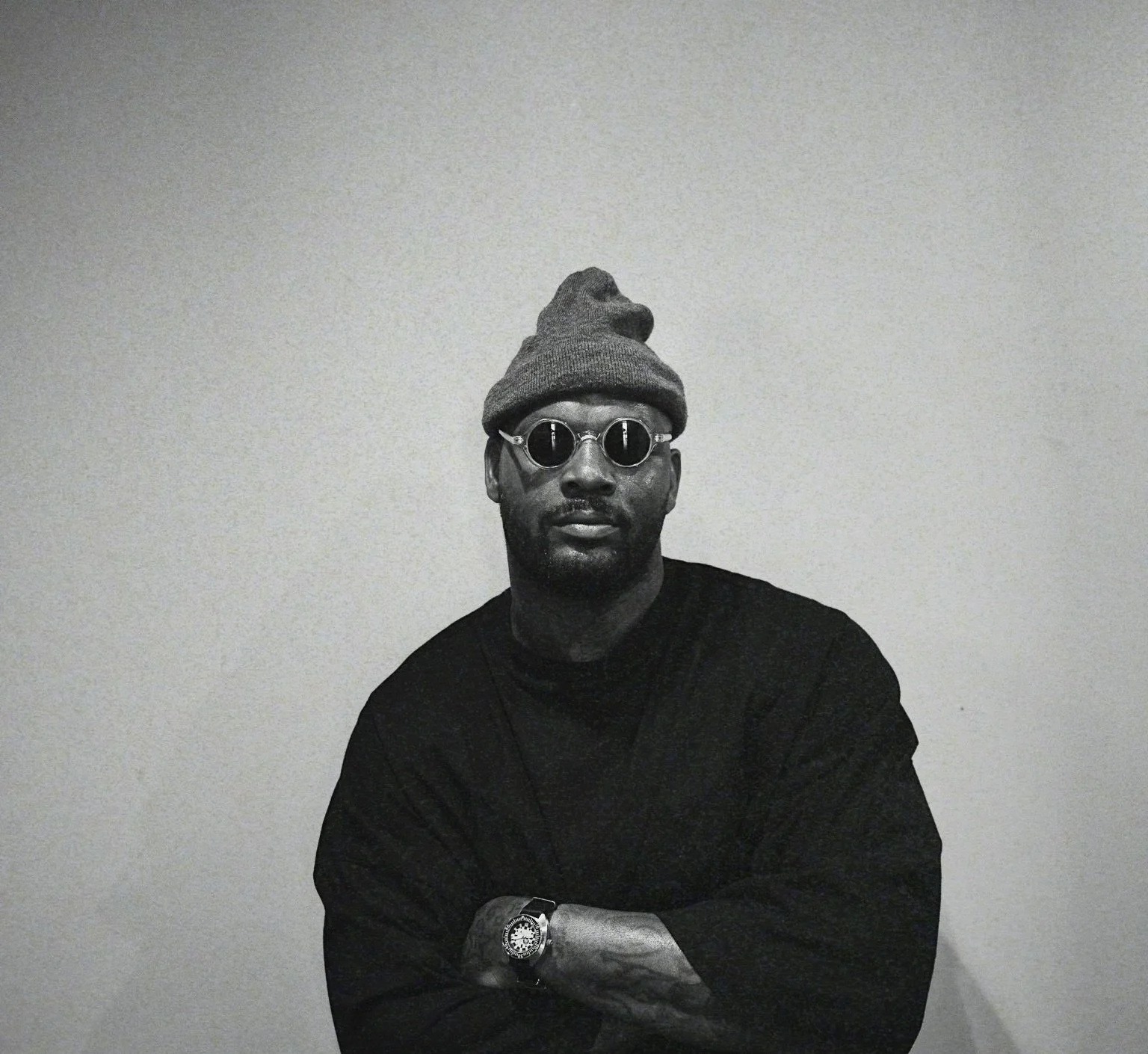 A man wearing sunglasses and a beanie hat with a pom-pom, dressed in a black long-sleeve shirt, crossing his arms against a plain wall.